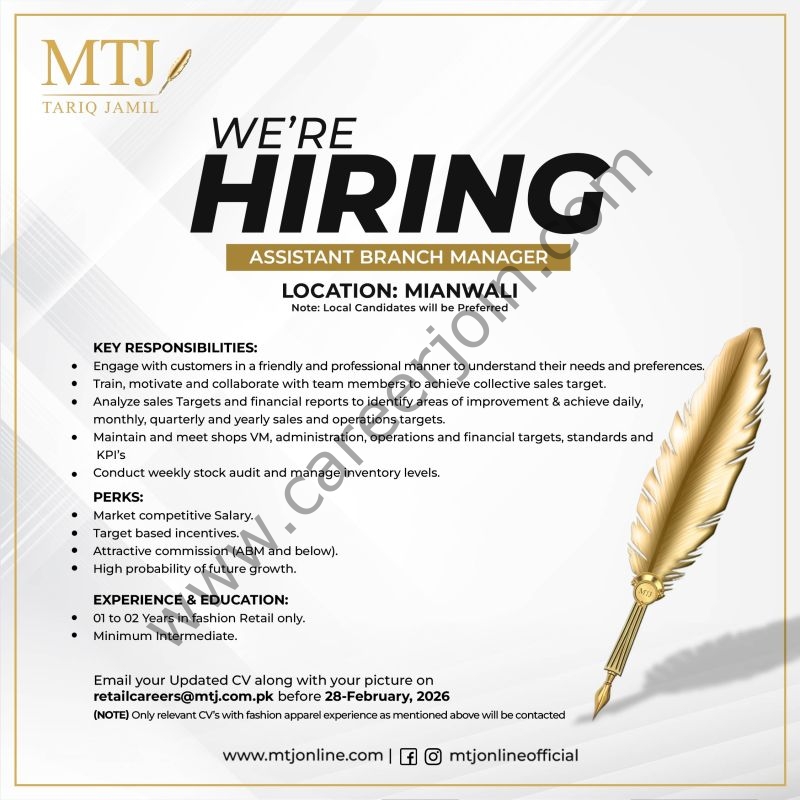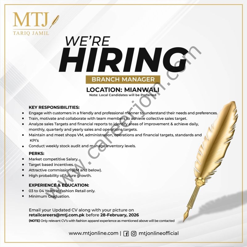 Please share your resume at retailcareers@mtj.com.pk with the position mentioned in the subject.