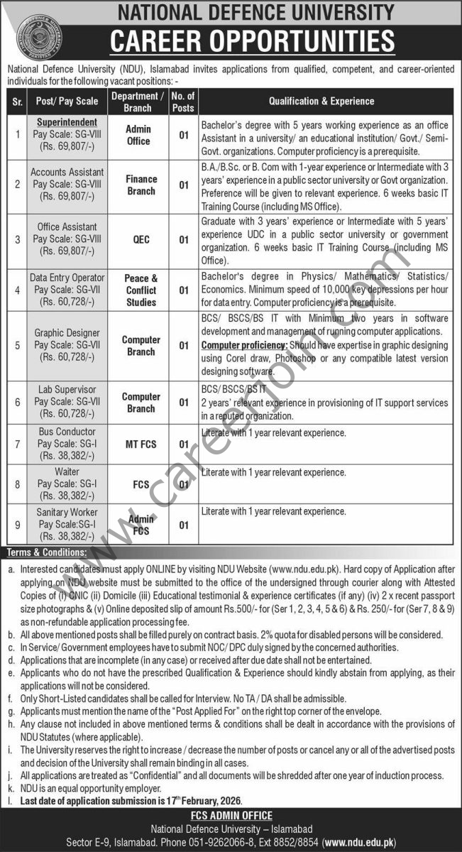 National Defence University NDU Jobs February 2026