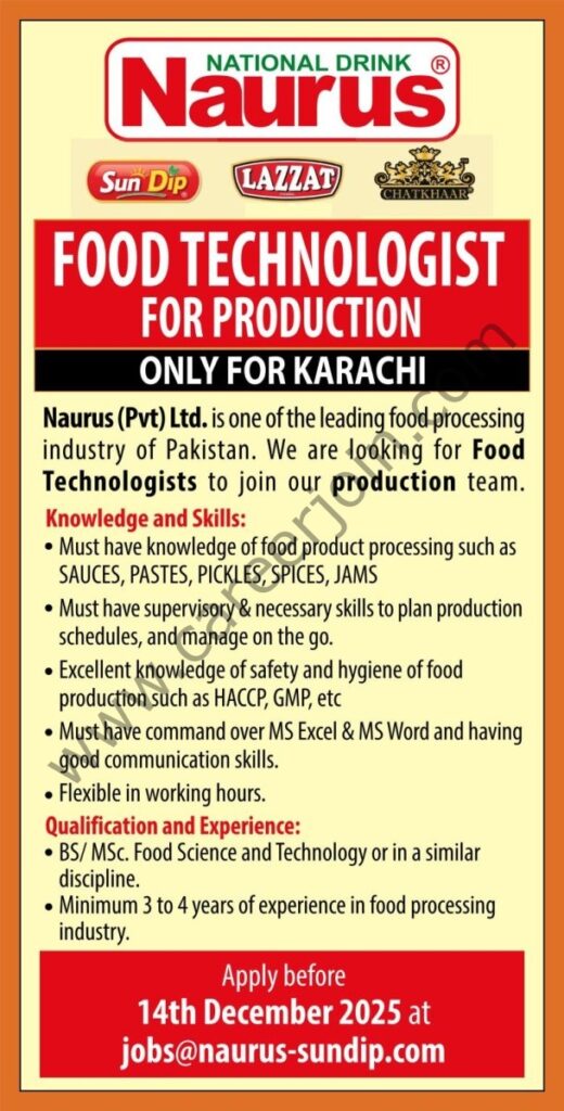 Naurus (Pvt) Ltd. is one of the leading food processing industry of Pakistan. We are looking for Food Technologists to join our production team.