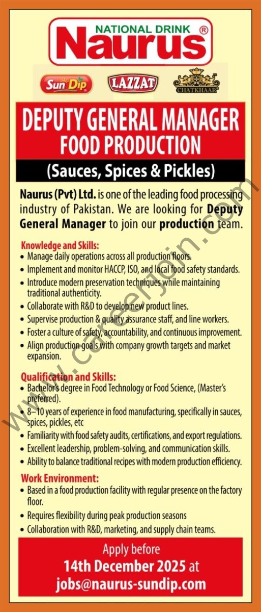Naurus (Pvt) Ltd. is one of the leading food processing industry of Pakistan. We are looking for Deputy General Manager to join our production team.