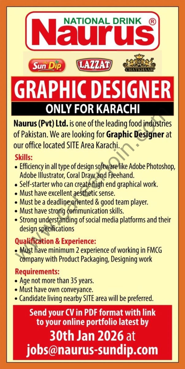 Naurus (Pvt) Ltd. is one of the leading food industries of Pakistan. We are looking for Graphic Designer at our office located SITE Area Karachi.