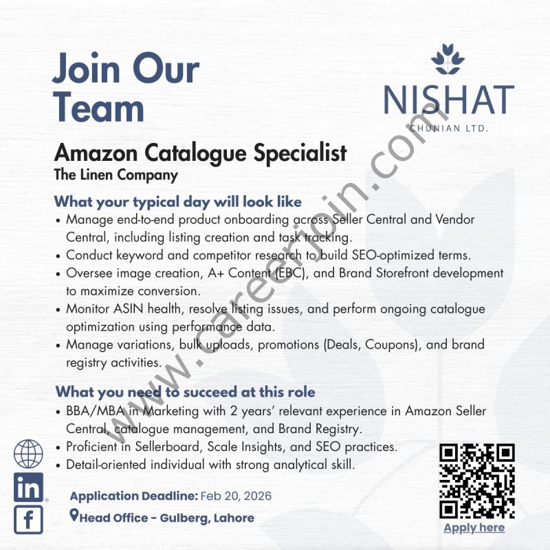 Nishat Chunian Limited Jobs Amazon Catalogue Specialist