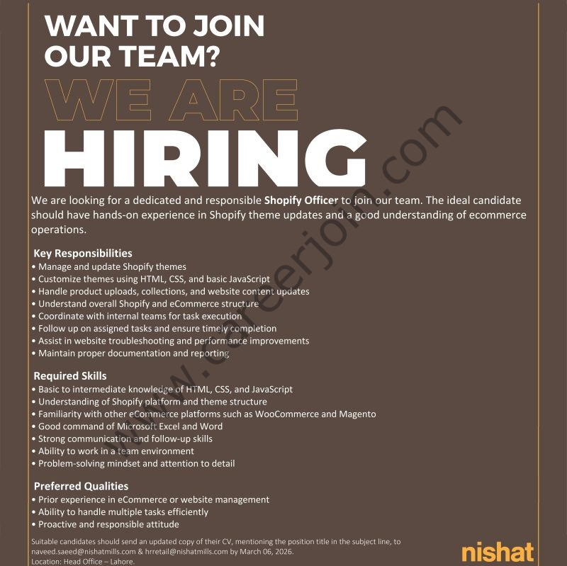 How to Apply: Suitable candidates should send an updated copy of their CV, mentioning the position title in the subject line, to naveed.saeed@nishatmills.com & hrretail@nishatmills.com by March 06, 2026.