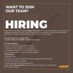 Apply at Hrretail@nishatmills.comwith subject line “Supervisor – Supply Chain” Till September 06,2025
