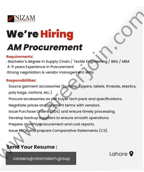 Nizam Sons Pvt Ltd is looking for a dynamic Assistant Manager Procurement to join our team in Lahore. The ideal candidate should have strong experience in procurement, vendor management, and negotiation, preferably within the textile or garment manufacturing industry.