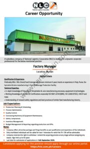 Company of National Logistics Corporation (NLC) is looking for a dynamic corporate professional for the below mentioned position Factory Manager Location: Multan Position Criteria Qualification & Experience.