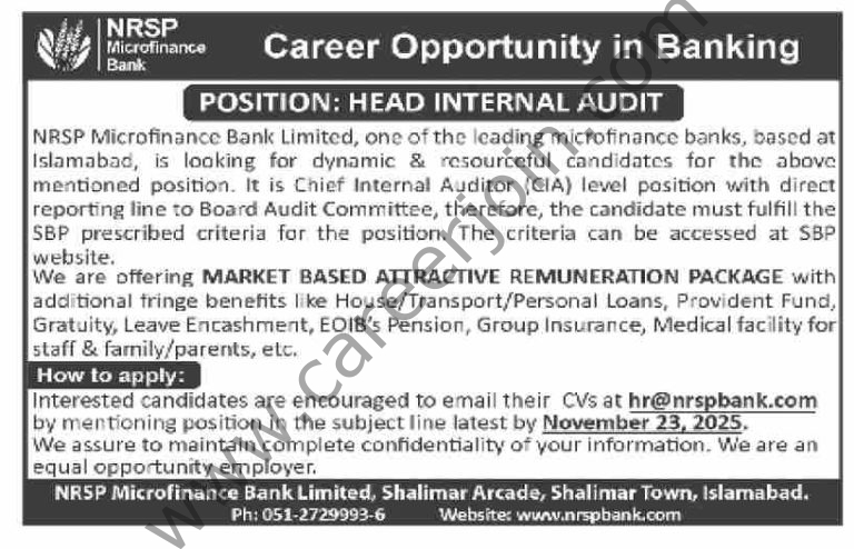 NRSP Microfinance Bank Jobs Head Internal Audit
