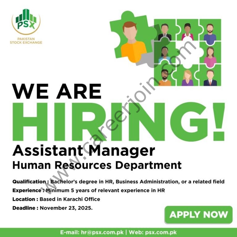 Pakistan Stock Exchange (PSX) is looking for a qualified and motivated professional for the position of Assistant Manager – Human Resources, in the Human Resources Department, based at our Head Office in Karachi.
