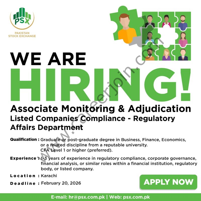 Pakistan Stock Exchange is seeking an Associate for Monitoring & Adjudication in the Listed Companies Compliance – Regulatory Affairs Department, based at our Head Office in Karachi.Application deadline: February 20, 2026