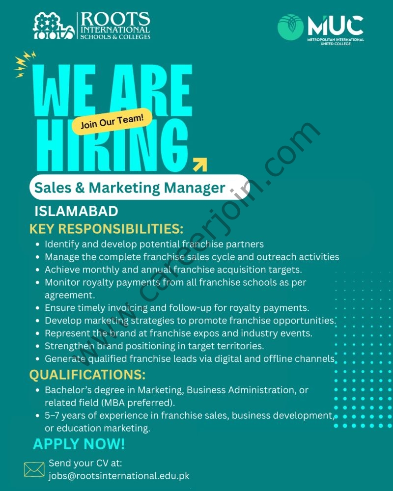 Send your CV at: jobs@rootsinternational.edu.pk