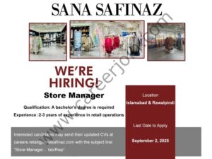 At careers.retail@sanasafinaz.com with the position “Store Manager Isb/ Rwp” in the subject line.