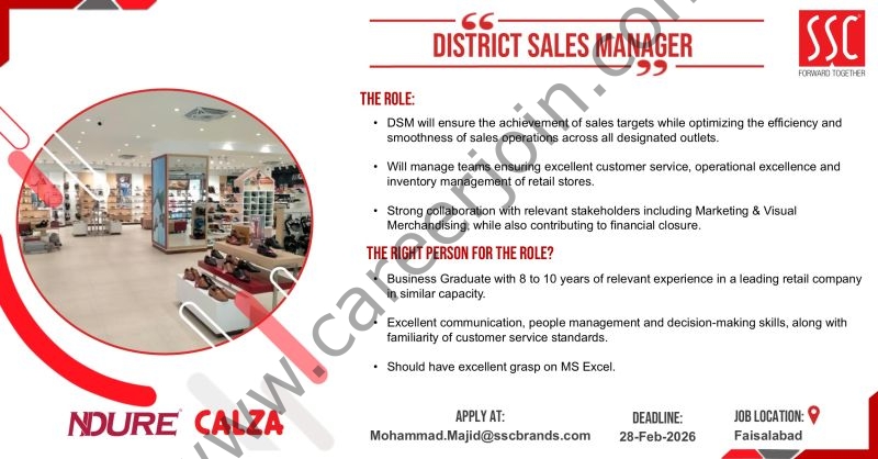SSC is currently looking to hire a District Sales Manager for the Faisalabad district. If you are a results-driven sales professional with strong leadership skills and experience in managing field teams, this could be a great opportunity to grow your career.