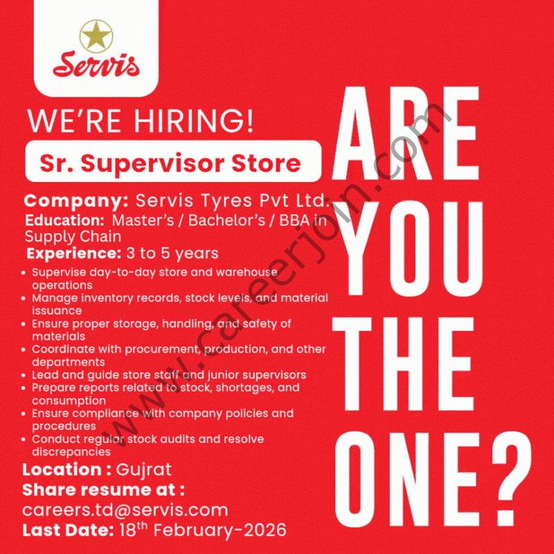 Servis Tyres Pvt Ltd is looking to hire a Sr. Supervisor Store.