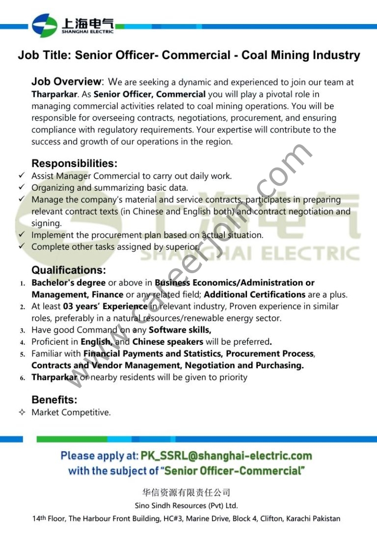 Job Overview:We are looking for an experienced and hardworking Senior Officer (Commercial) to join our team in Tharparkar. The person in this position will be responsible for the commercial aspects of coal mining. Your experience and expertise will help us grow and succeed in our company.