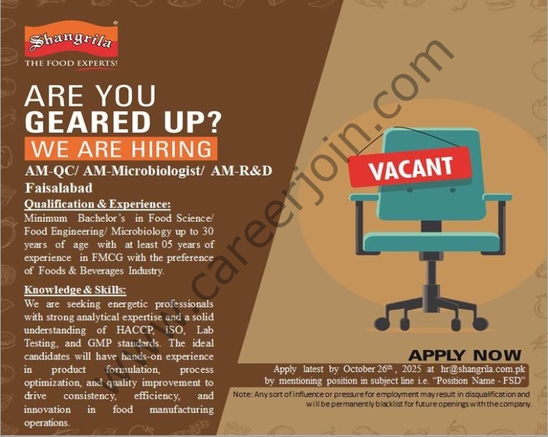 Candidates meeting the above criteria must send their CV’s at hr@shangrila.com.pk