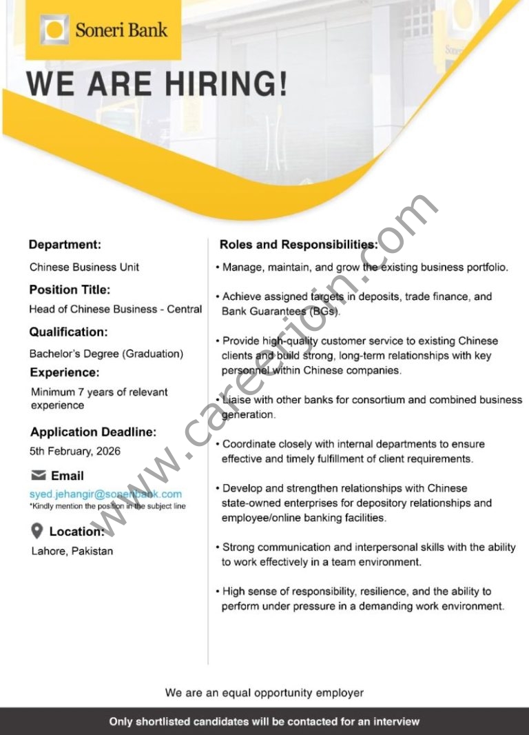 Soneri Bank is looking for Head of Chinese Business – Central, Chinese Business Unit Department.