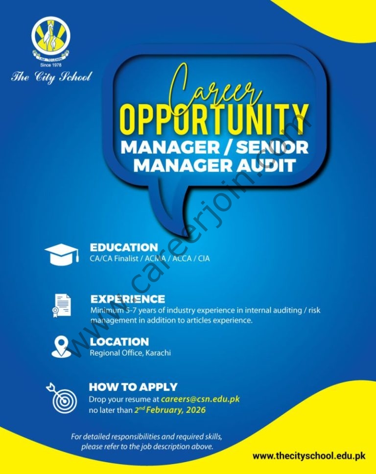 TheCitySchool is looking to fill the position of Manager/Senior Manager Audit at the Regional Office, Karachi.