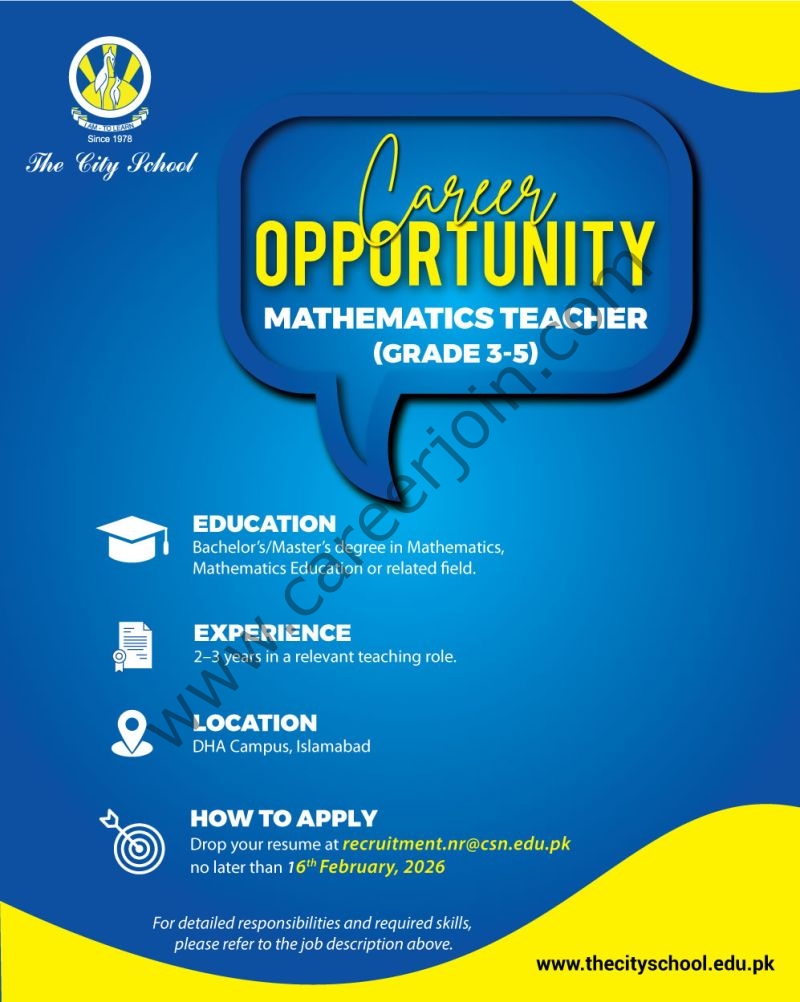 TheCitySchool is looking to fill the position of Mathematics Teacher (Class 3 to 5) at the DHA Campus, Islamabad.