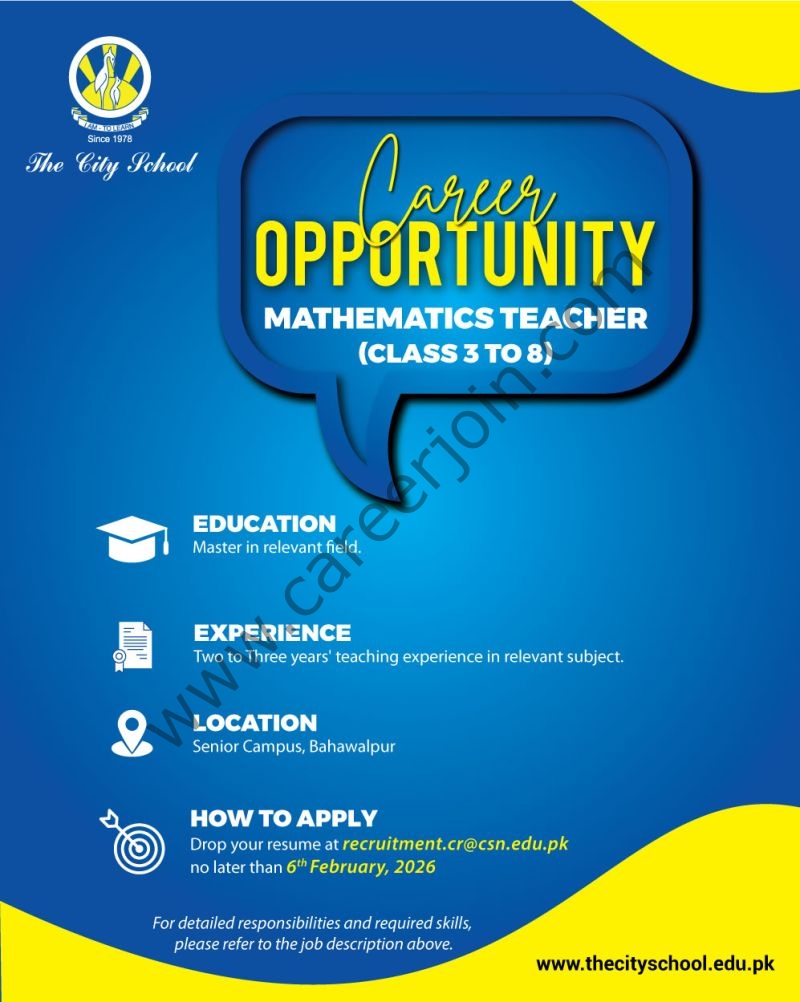 TheCitySchool is looking to fill the position of Mathematics Teacher (Class 3 to 8) at the Senior Campus, Bahawalpur.