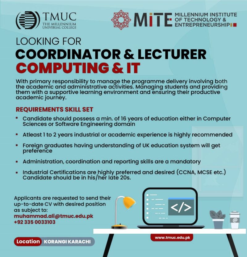 TMUC The Millennium Universal College Jobs Coordinator & Lecturer