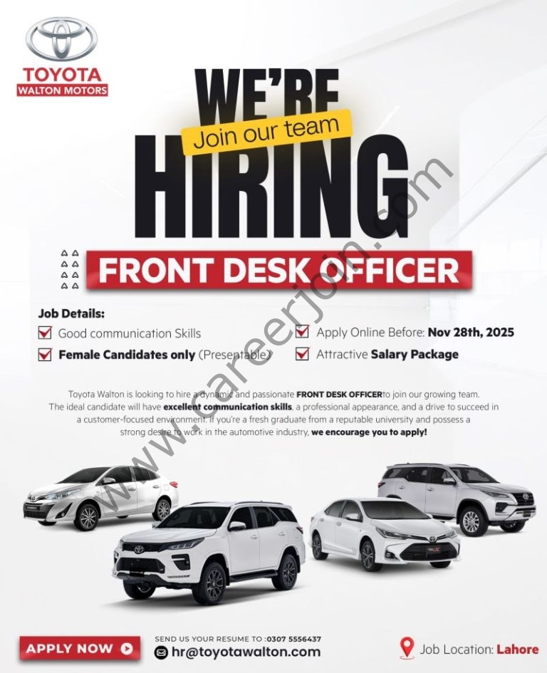 TOYOTA WALTON MOTORS is looking for a Front Desk Officer (Presentable Female) to join our team!