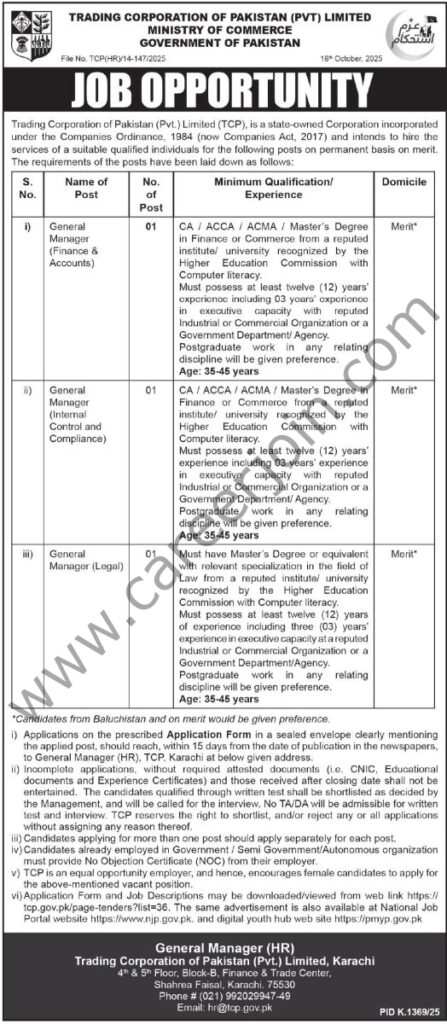 Trading Corp of Pakistan Pvt Ltd TCP Jobs October 2025