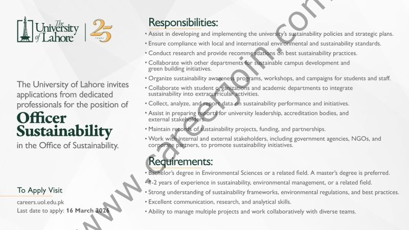 Apply before 16 March 2026 at careers.uol.edu.pk