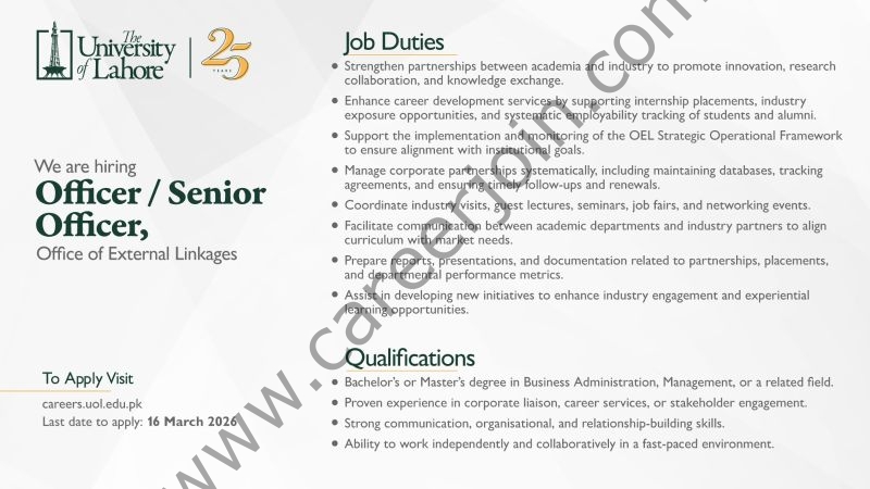 Submit your application before 16 March 2026 at careers.uol.edu.pk