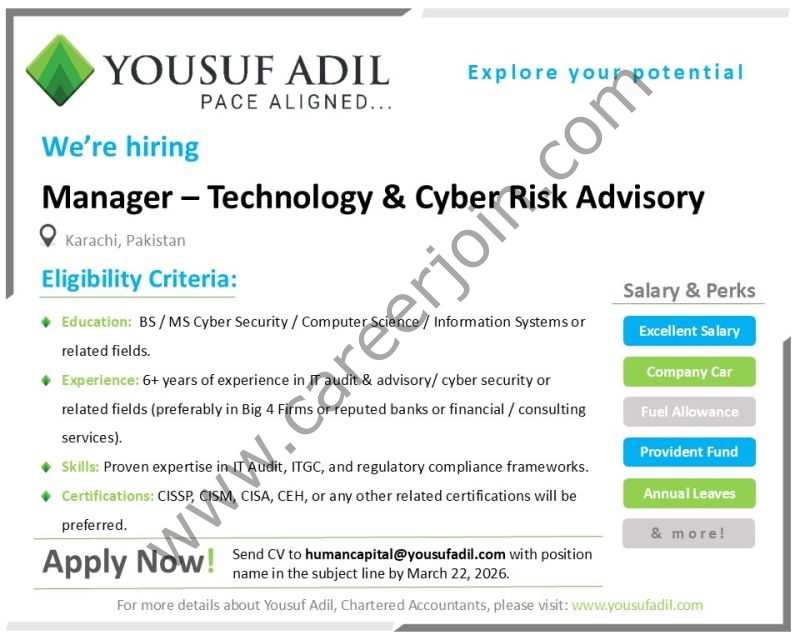 Yousuf Adil, Chartered Accountants is hiring for the position of ‘Manager – Technology & Cyber Risk Advisory‘ for Karachi Office. Candidates with related experience are encouraged to apply with confidence at the earliest!