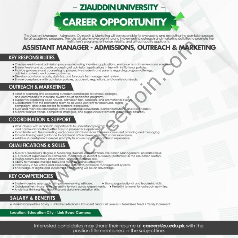 Ziauddin University Jobs Assistant Manager Admissions Outreach & Marketing